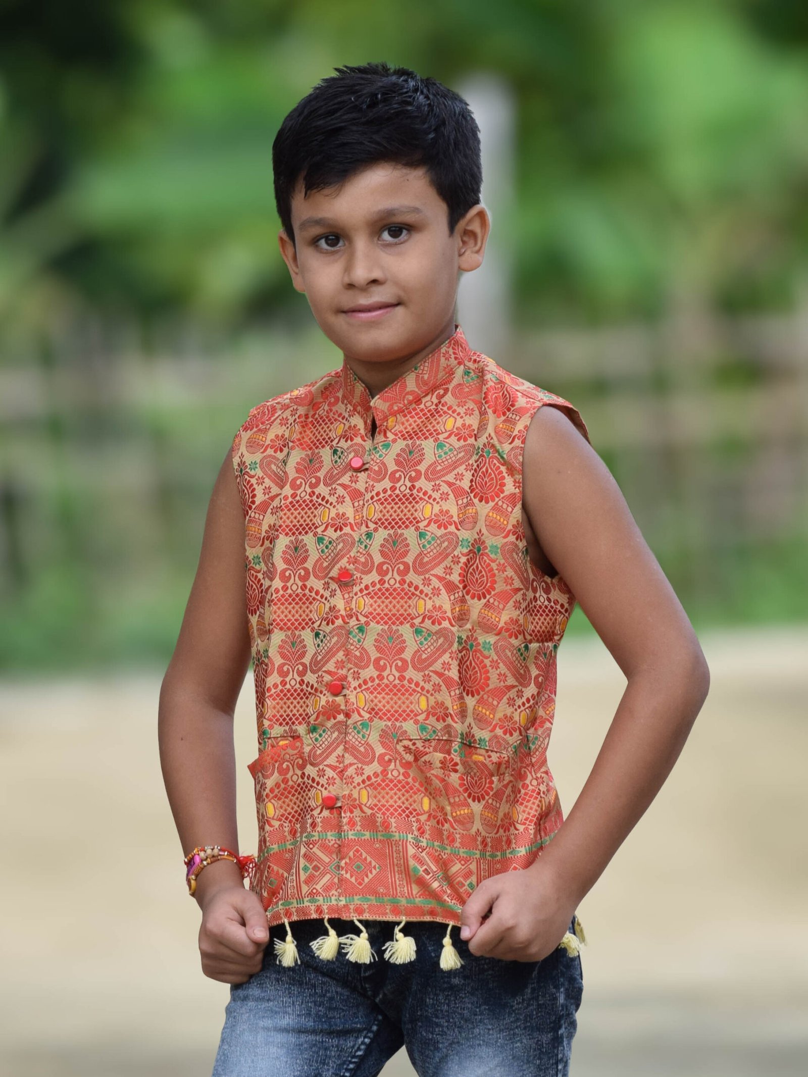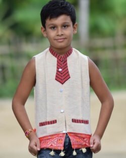 It’s traditional Kids wear. The product is completely handmade, which waistcoat fabric is cotton, and it’s very comfortable to wear. As it’s completely handmade so each piece is unique and similar pieces will be available but all the pieces will not same in design. It has been designed by tribal artisans of Assam.